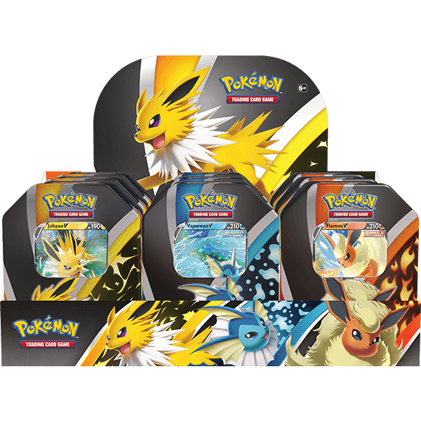 Bringe dein Spiel auf die nächste Stufe mit Eevees Original-Evolutionen! Wähle in der Pokémon TCG: Eevee Evolutions Tin die schnell ziehende Kraft des Wasser-Typs Vaporeon V, die elektrisierende Energie des Blitz-Typs Jolteon V oder die konzentrierten Flammen des Feuer-Typs Flareon V! Jede dieser farbenfrohen Dosen enthält eine Handvoll Pokémon TCG-Schätze sowie ein Pokémon, das bereit ist, sich im Kampf zu beweisen!