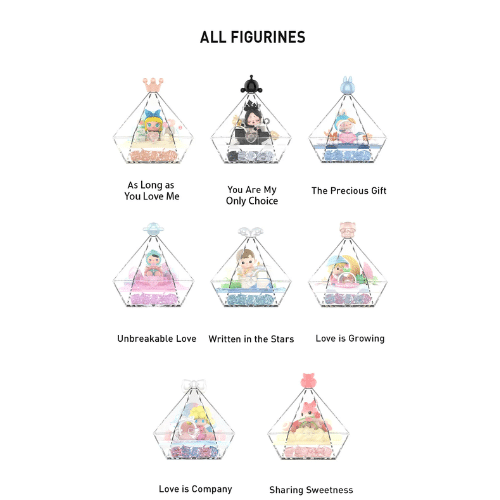 Ontdek de betoverende Wishes at Your Fingertips Series Scene Set van POP MART. Deze set bestaat uit acht unieke miniatuurfiguren, elk verpakt in een diamantvormige doos met een kleurrijk kristalontwerp.
